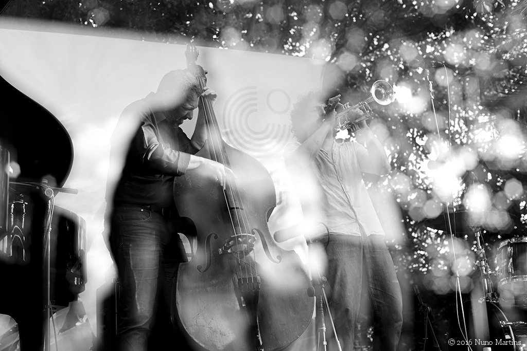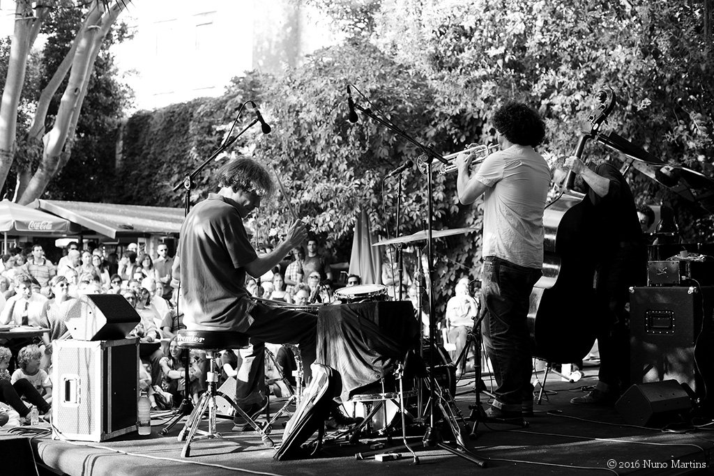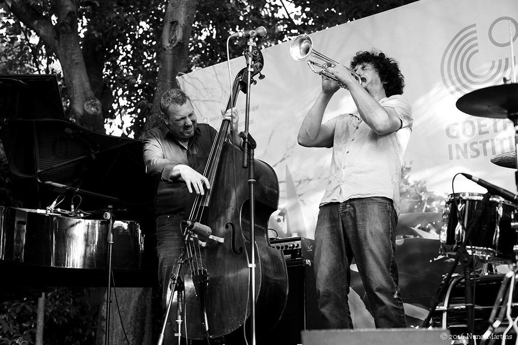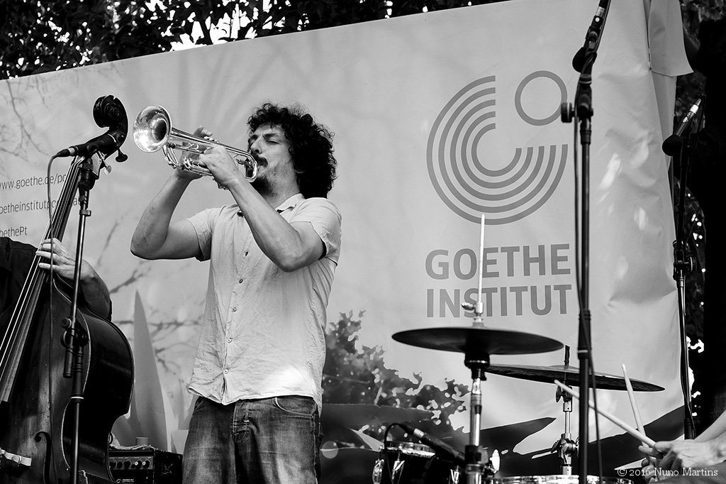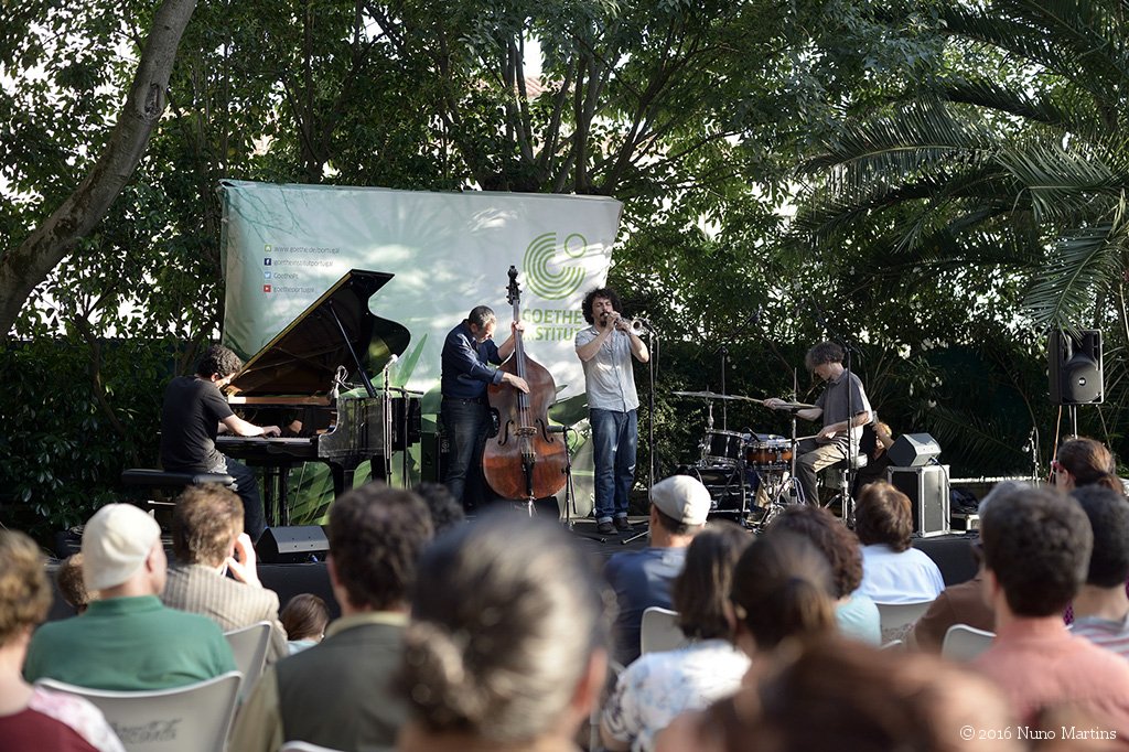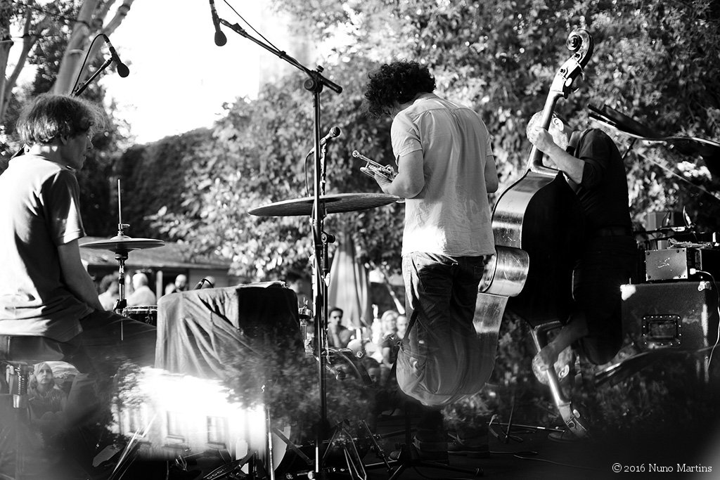 Clocks and CloudsLuís Vicente trumpet Hernâni Faustino doublebass Rodrigo Pinheiro piano Marco Franco drums live @ Jazz im Goethe Garten, Goethe Institut, Lisboa, 5 July 2016