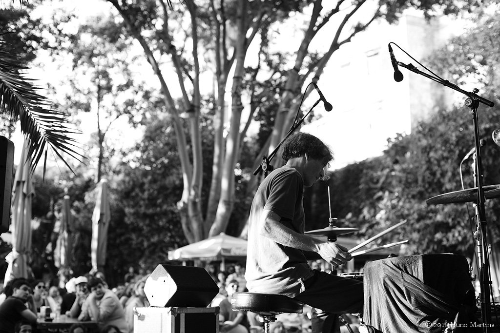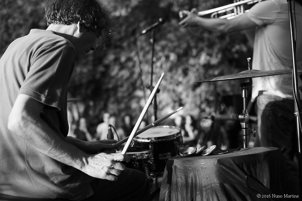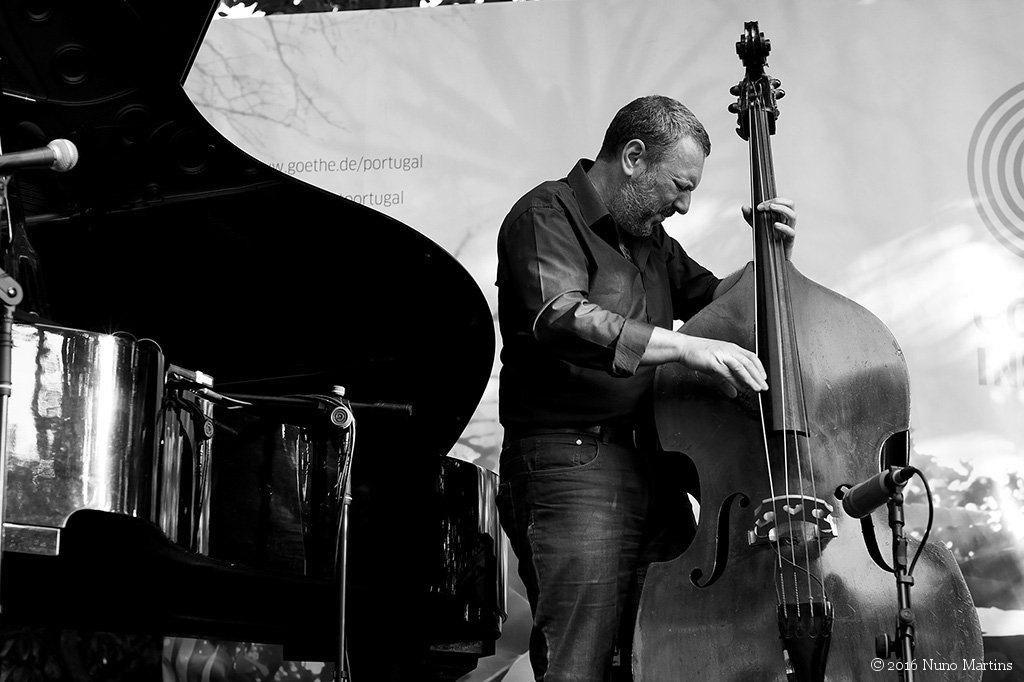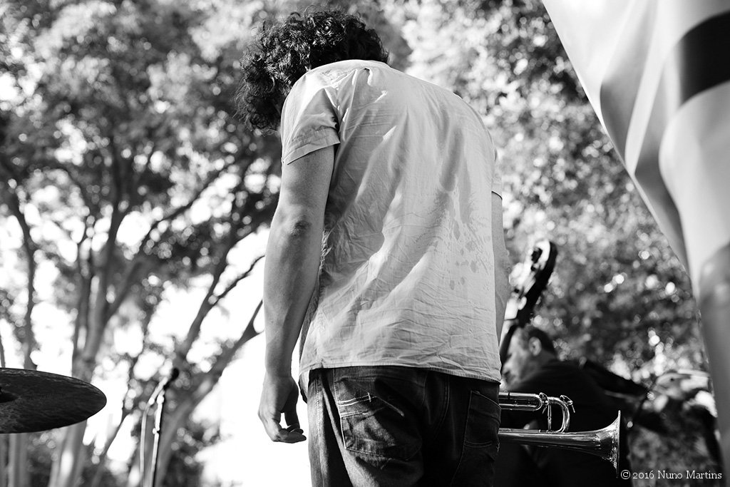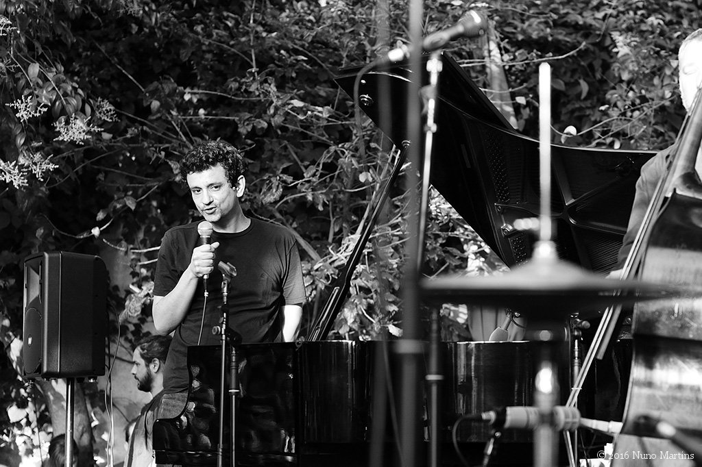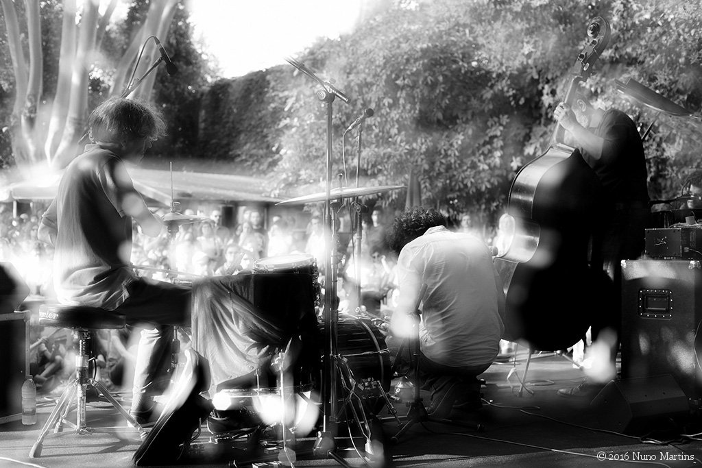 Clocks and CloudsLuís Vicente trumpet Hernâni Faustino doublebass Rodrigo Pinheiro piano Marco Franco drums live @ Jazz im Goethe Garten, Goethe Institut, Lisboa, 5 July 2016