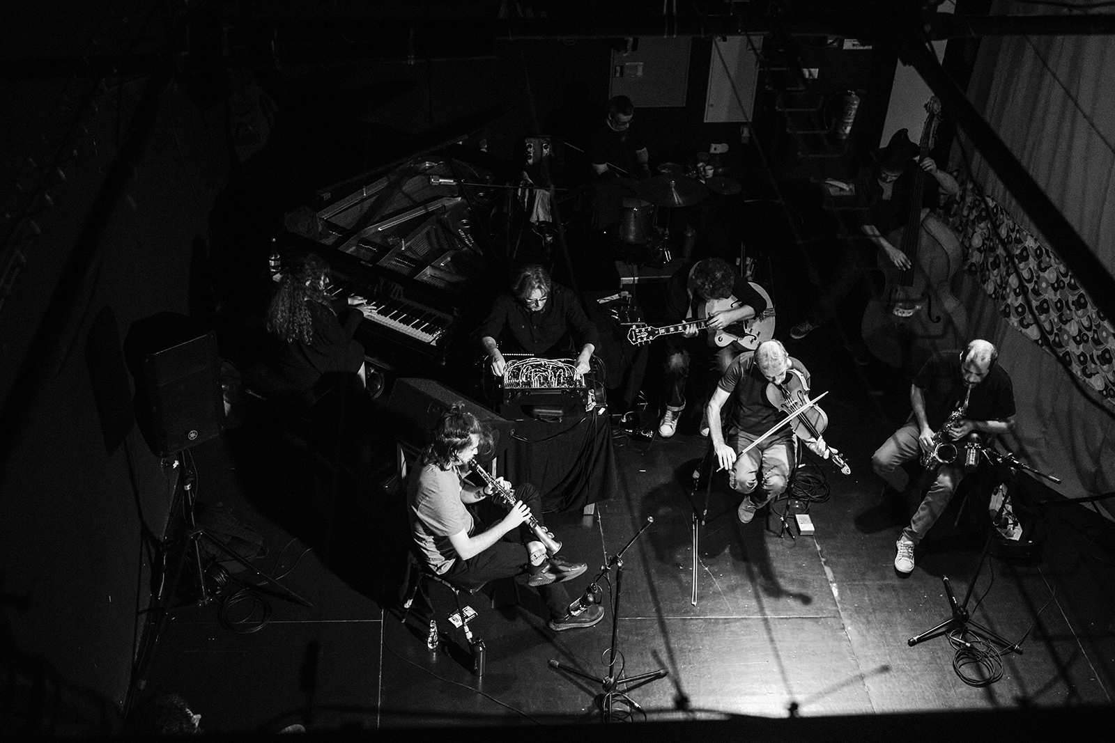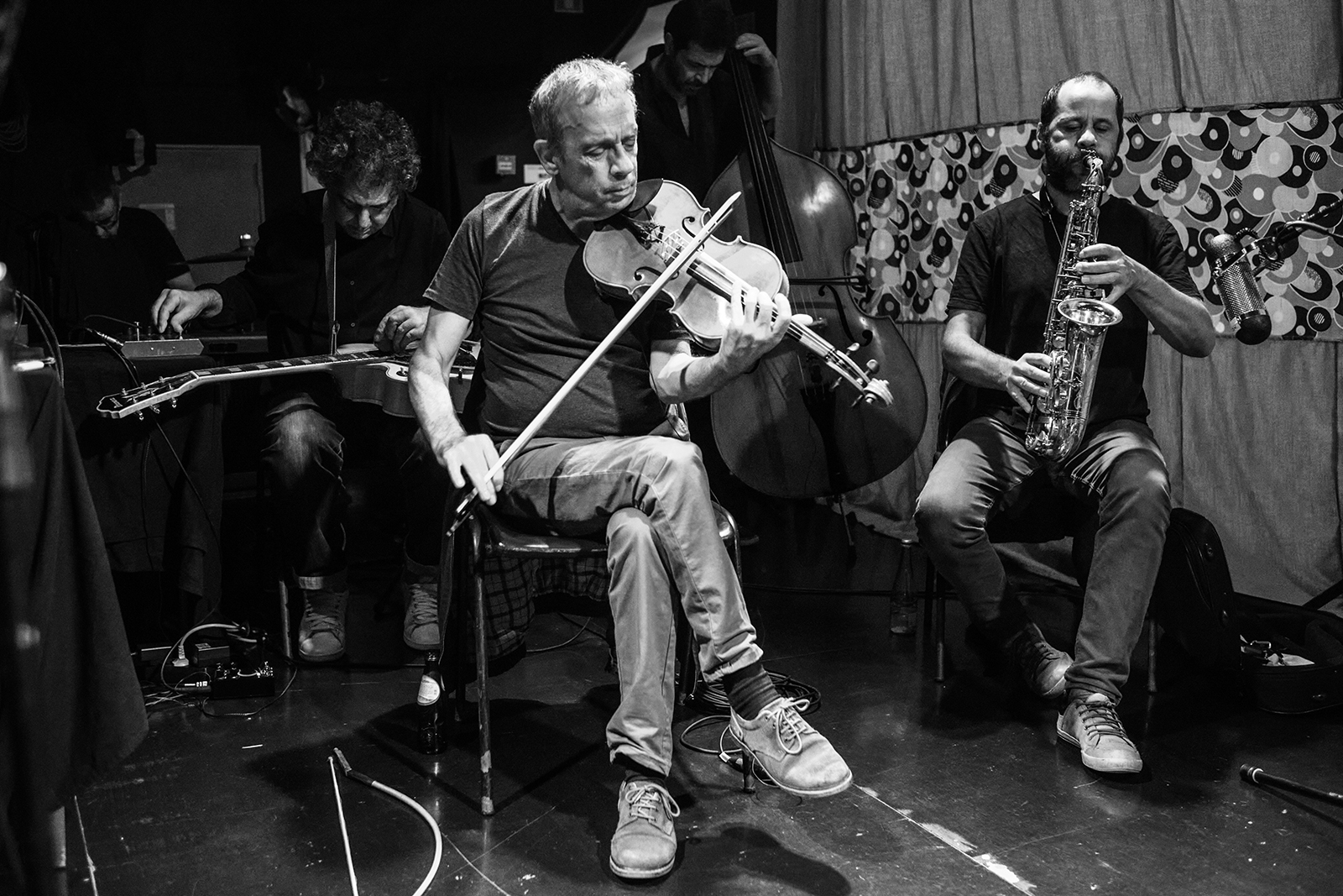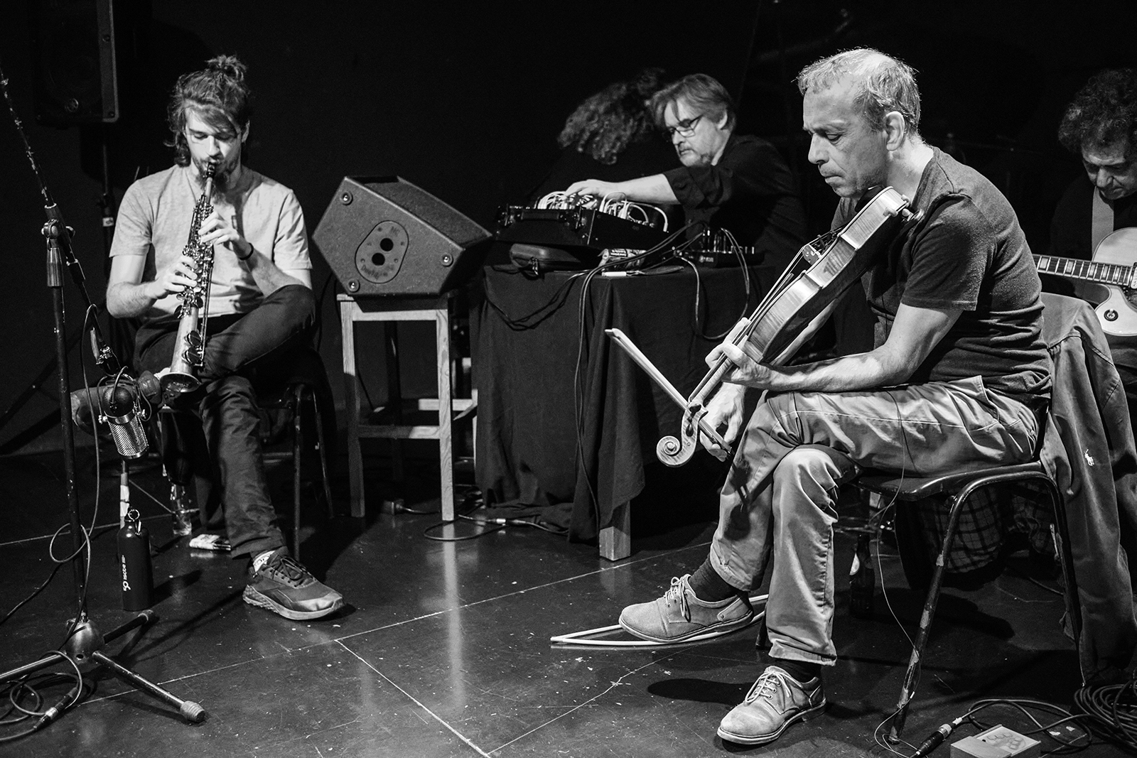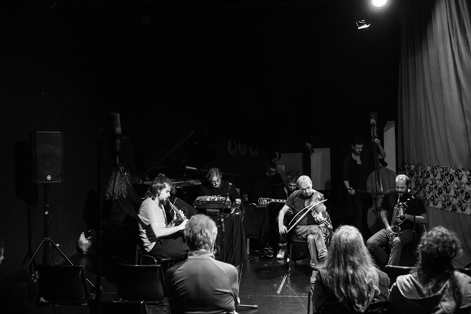 SuspensãoErnesto Rodrigues viola Nuno Torres alto saxophone João Gato soprano saxophone Flak electric guitar Carlos Santos electronics Luísa Gonçalves piano João Madeira doublebass José Oliveira drums live @ SMUP, Parede, 27 May 2023